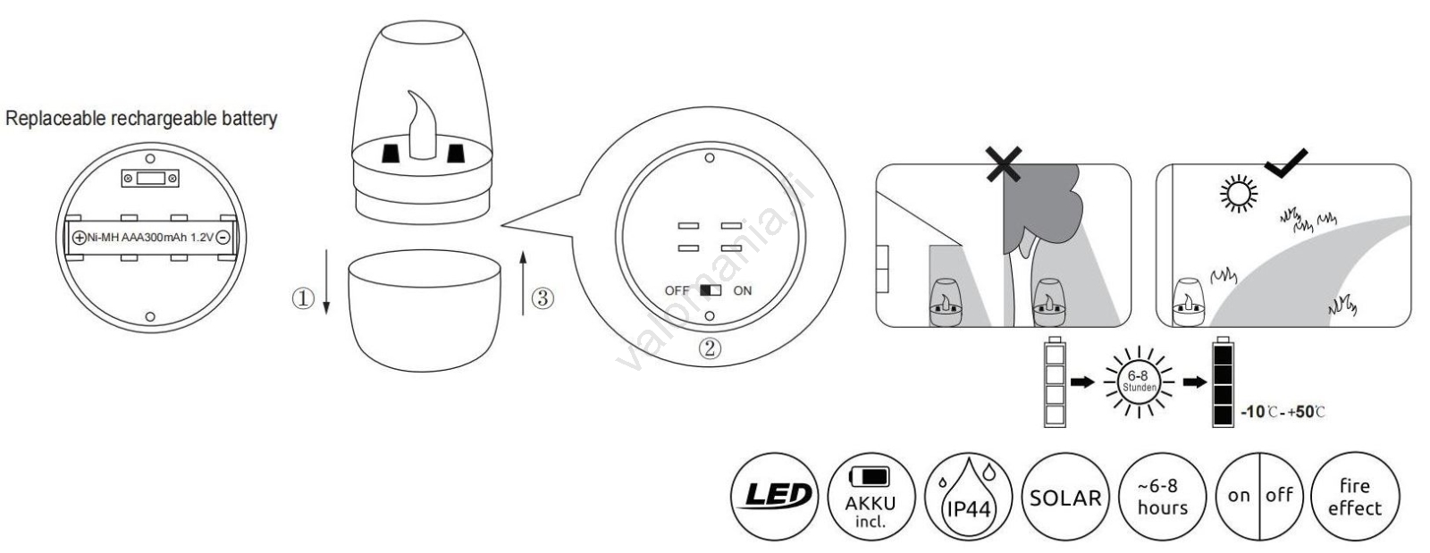 | Toiminto | LED-tekniikka; Aurinkoteknologia; Katkaisin sijaisee valaisimen rungossa |