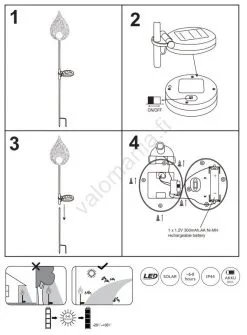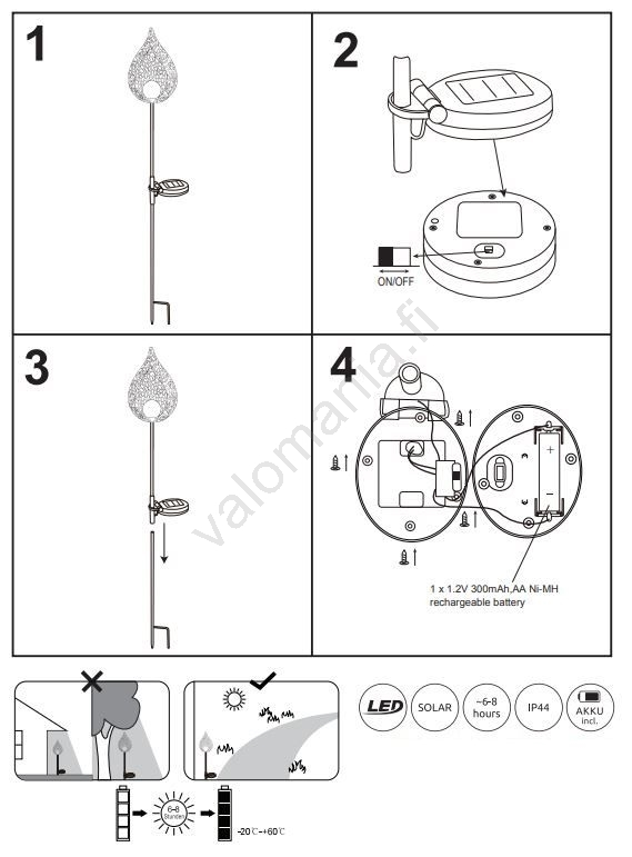 | Toiminto | LED-tekniikka; Aurinkoteknologia; Katkaisin sijaisee valaisimen rungossa |