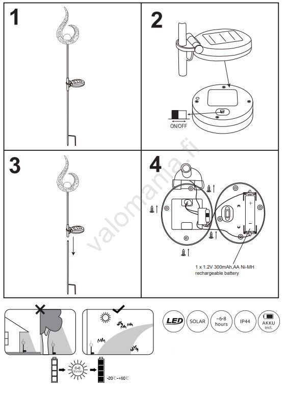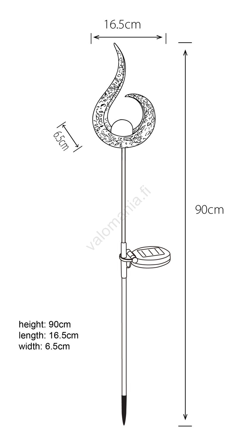 | Toiminto | LED-tekniikka; Aurinkoteknologia; Katkaisin sijaisee valaisimen rungossa |