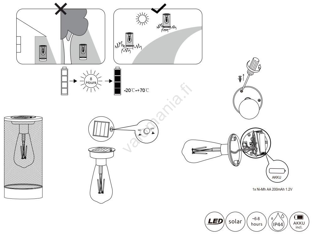 | Toiminto | LED-tekniikka; Aurinkoteknologia; Katkaisin sijaisee valaisimen rungossa |