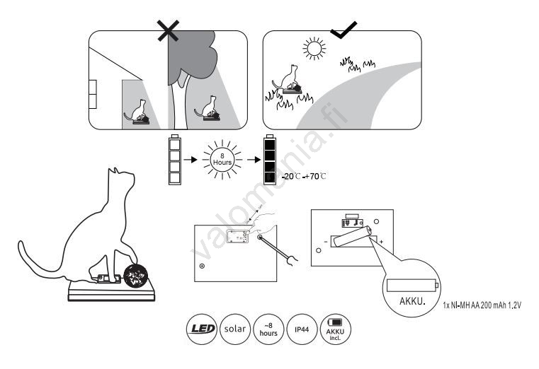 | Toiminto | LED-tekniikka; Aurinkoteknologia; Katkaisin sijaisee valaisimen rungossa |
