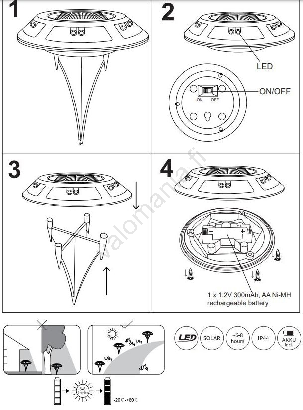 | Toiminto | LED-tekniikka; Aurinkoteknologia; Katkaisin sijaisee valaisimen rungossa |