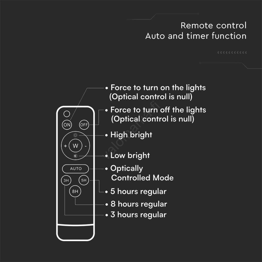| Toiminto | LED-tekniikka; Aurinkoteknologia; Kaukosäädin |