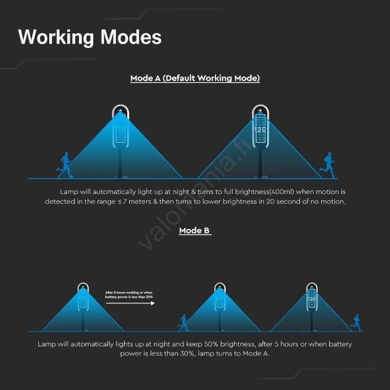 - Tila B – lamppu syttyy automaattisesti 50 %:n kirkkaudella pimeän tullessa ja siirtyy tilaan A 5 tunnin kuluttua tai kun akun varaus laskee alle 30 %.