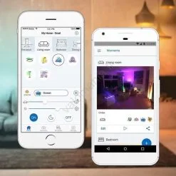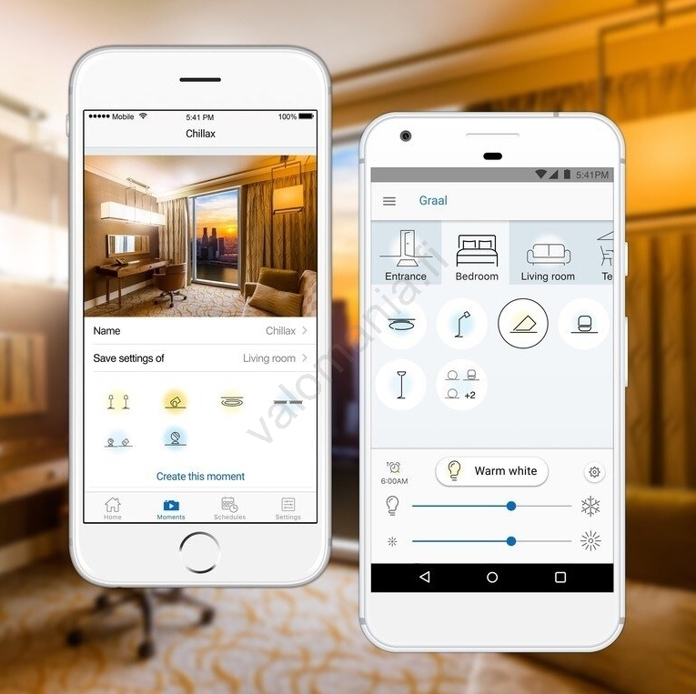 - Mobiilisovelluksella voit ohjata valoja valitun huoneen mukaan, lisätä useita käyttäjiä ja luoda monenlaisia värikohtauksia ja tehosteita.