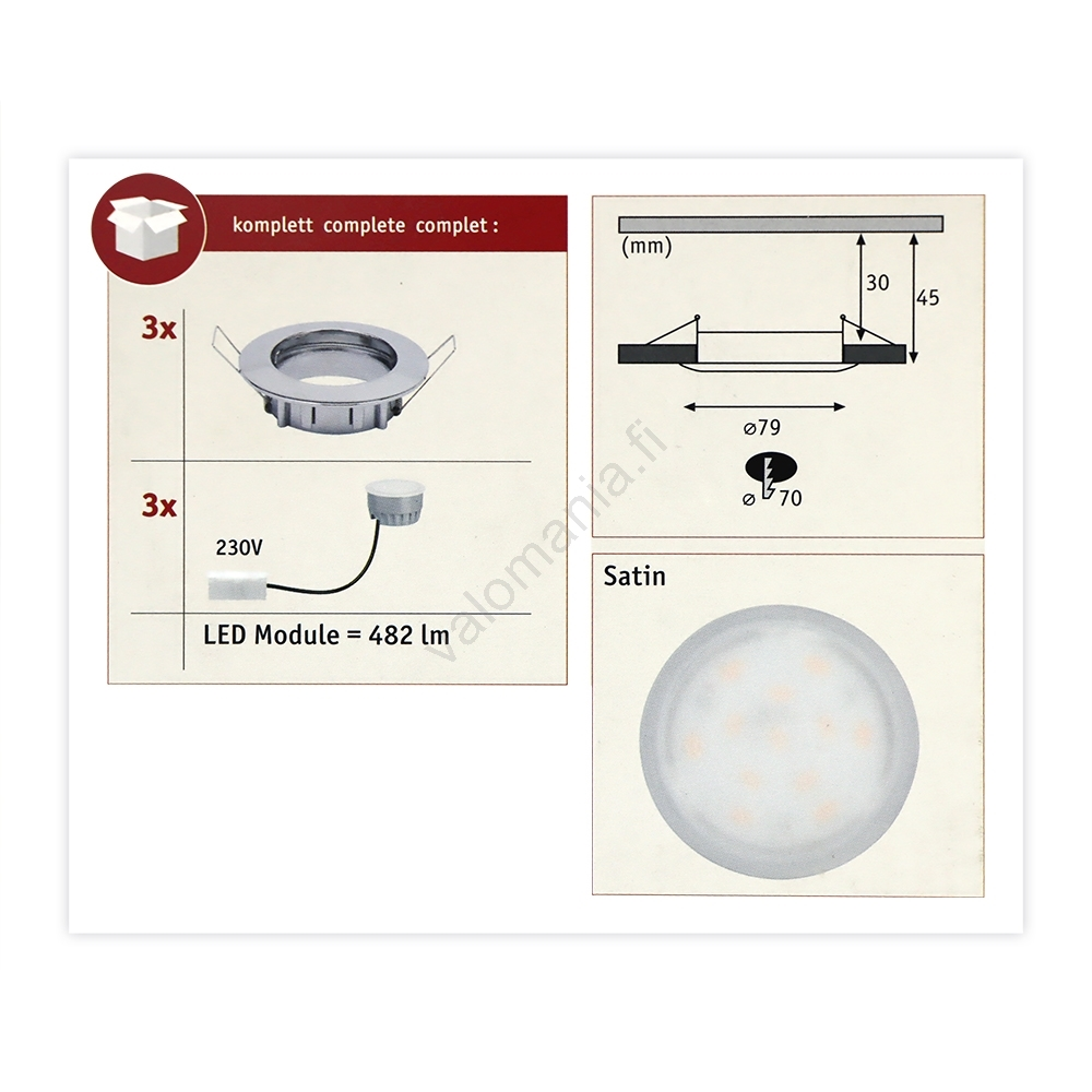 | Toiminto | LED-tekniikka; Himmennettävä, ilman himmennintä; Muuntaja sisältyy pakettiin |