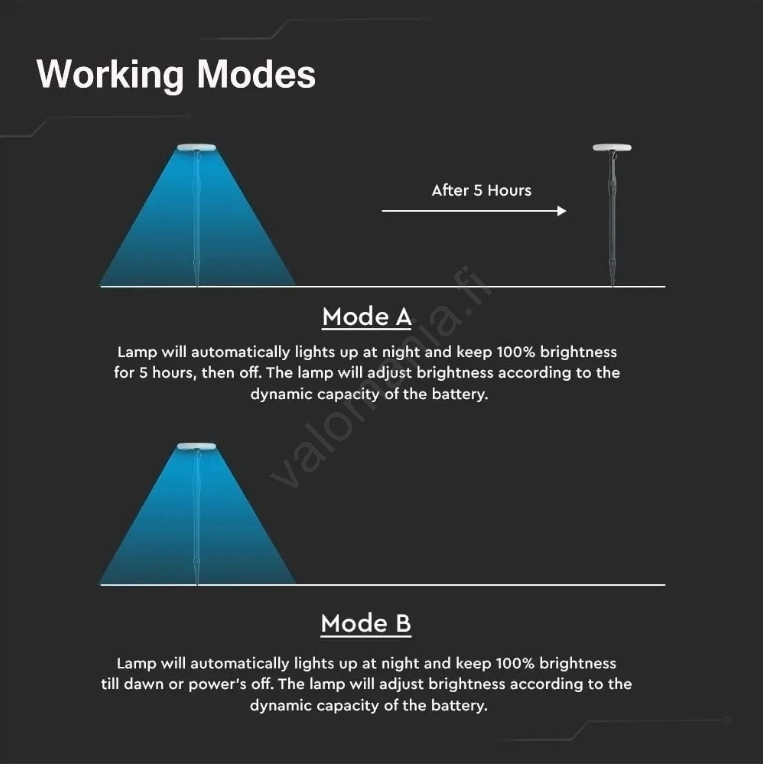 - Tila A – lamppu syttyy automaattisesti hämärtyessä ja syttyy 100 % kirkkaudella, 3 tunnin kuluttua se kytkeytyy 70 % kirkkaudelle ja vielä 2 tunnin kuluttua 50 % kirkkauteen, joka palaa, kunnes se on täysin purkautunut tai aamunkoittoon asti.